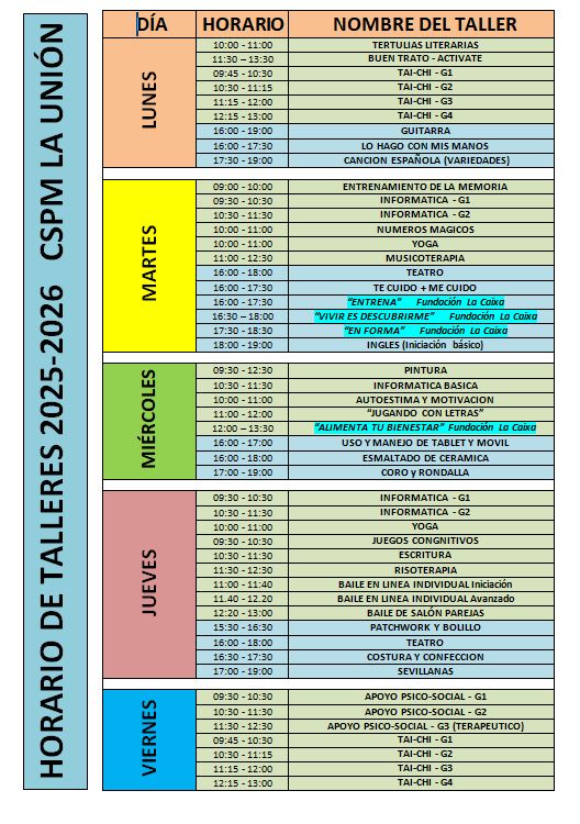 Desde hoy, se puede consultar en el tablón de anuncios del mismo el listado de usuarios admitidos a cada uno de los talleres y que darán inicio a partir del próximo día 15 de septiembre. Asimismo se ha publicado el horario y fechas de inicio de cada taller.